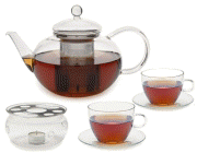 A simple, elegant tea set for two for brewing loose leaf or blooming teas (when used without the infuser). Includes 42 oz glass teapot, glass pot warmer and 2 glass cups and saucers.
